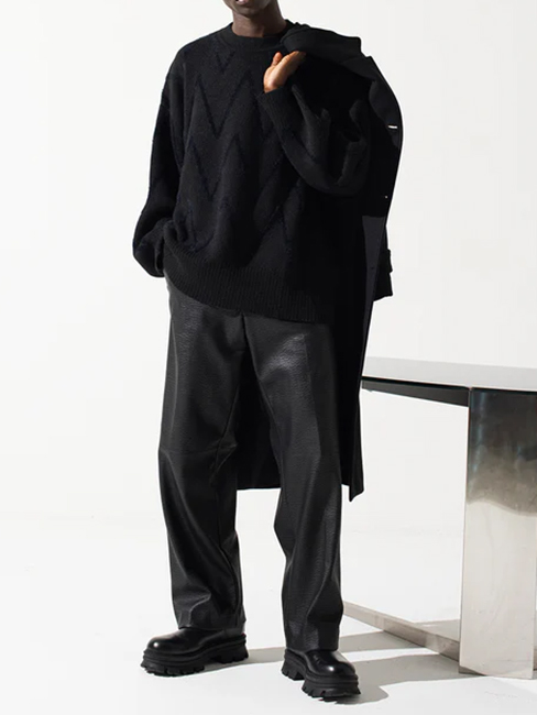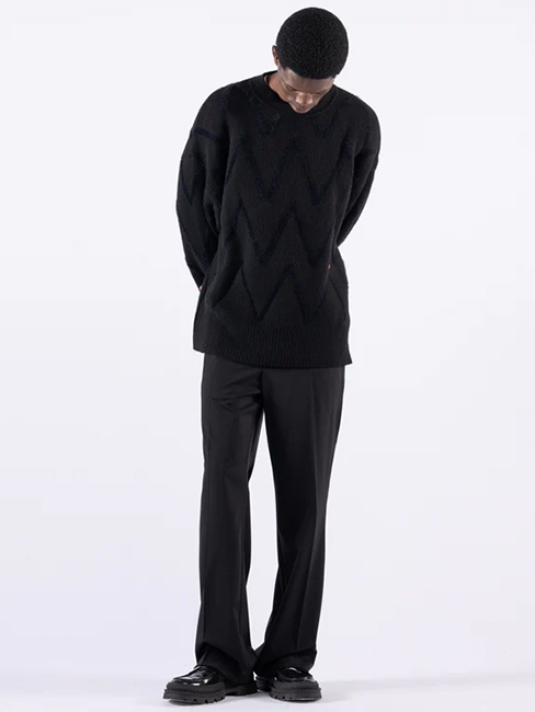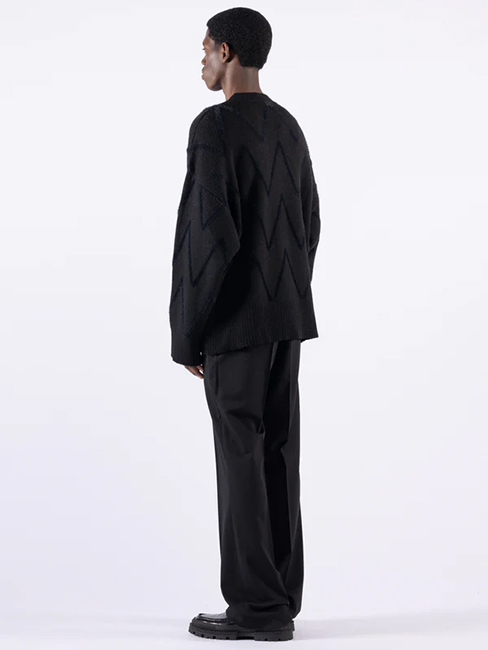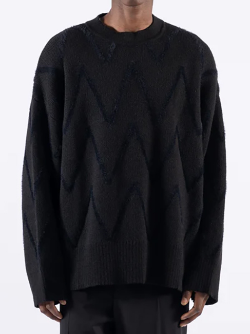 存在感を放つ幾何学モチーフ(ジグザグ風のジオメトリック柄)をあしらった、イタリア製オーバーサイズニットセーター。